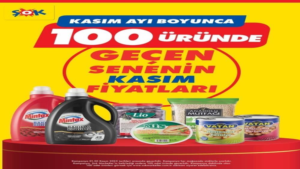 ŞOK Marketler, Kasım ayında yeni bir kampanya başlatarak müşterilerinin bütçesine katkı sağlamaya devam ediyor. 1-30 Kasım 2025 tarihleri arasında ŞOK Marketler’de 100 ürün, geçen senenin Kasım ayındaki fiyatlarıyla satışa sunuluyor.