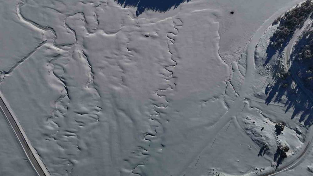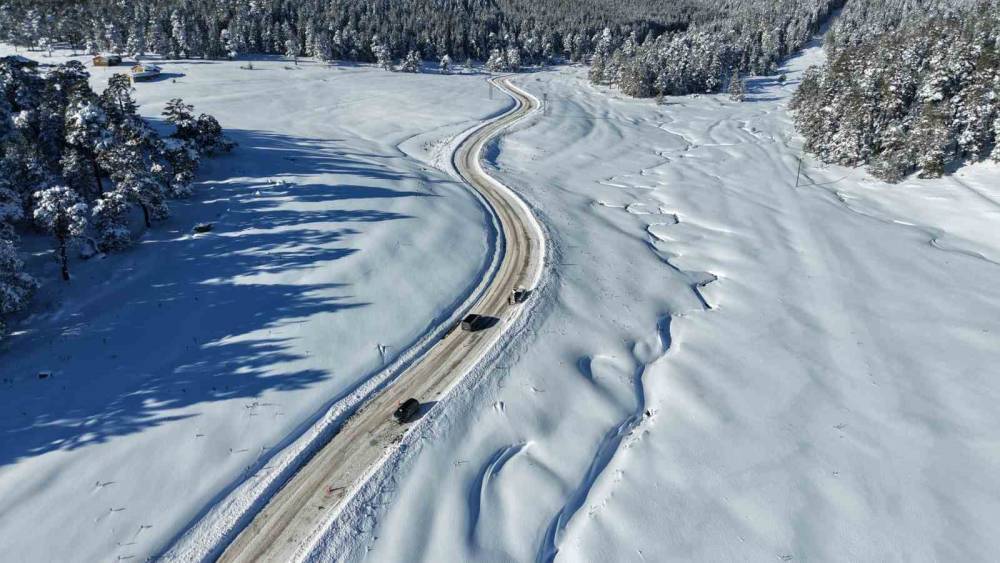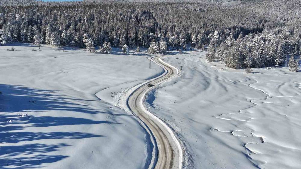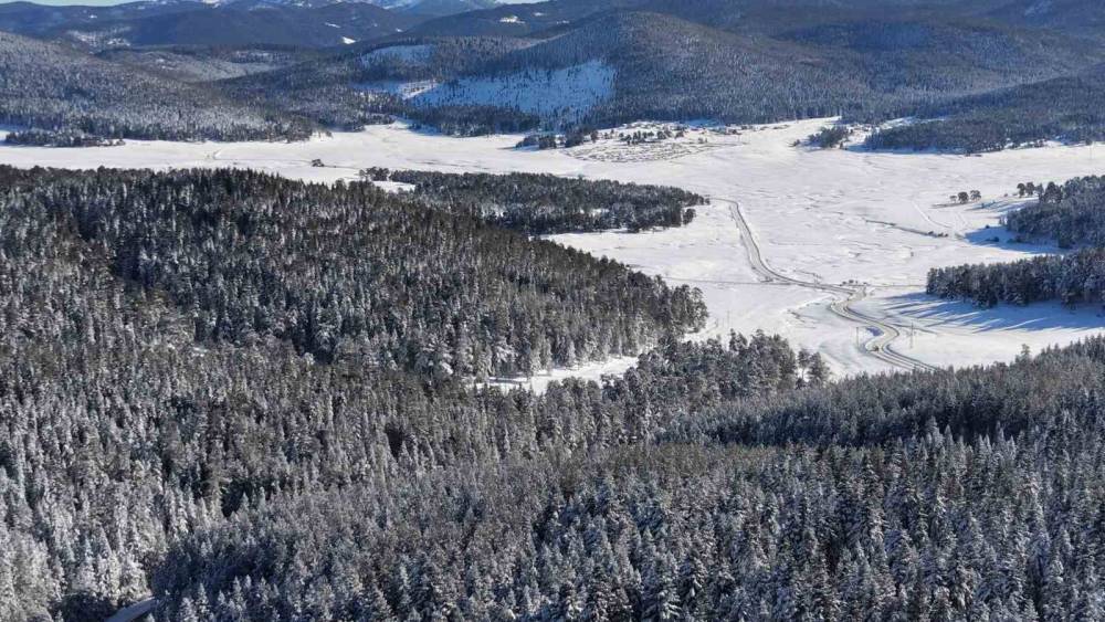 Bolu’nun güneydoğusunda Kartalkaya yolu üzerinde bulunan 14 köy yaylasından oluşan Sarıalan Yaylası, kış mevsiminin gelmesiyle birlikte beyaz örtüyle kaplandı. Yaylada oluşan kış manzarası havadan görüntülendi.