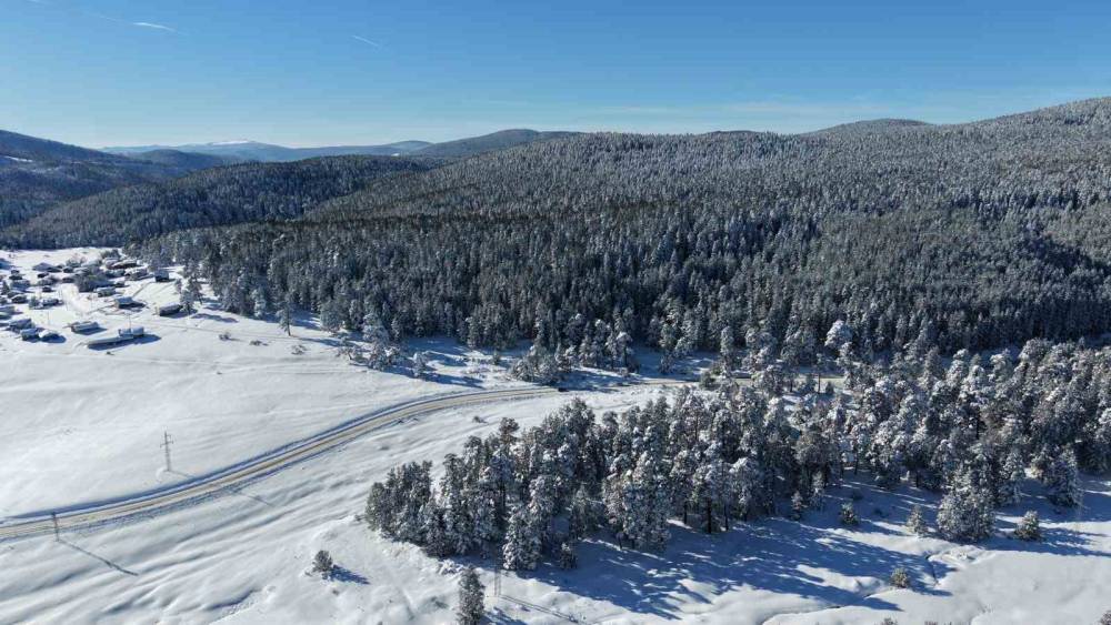 Bolu kent merkezine yaklaşık 20 kilometre mesafede konumlanan bölge, kar yağışının ardından eşsiz bir güzelliğe büründü. Bolu’nun güneydoğusunda yer alan Sarıalan, bünyesinde barındırdığı 14 farklı köy yaylası ile geniş bir alana yayılıyor. Çam ormanları arasındaki konumu ve düz yapısıyla özellikle kampçılar ve doğa tutkunları için benzersiz bir rota sunan yayla, sessizliği ve temiz havasıyla dikkat çekiyor. Kış mevsiminin etkisini göstermesiyle beyaza bürünen yayla evleri ve çam ağaçları, kartpostallık görüntüler oluşturdu. Bölgede yaşanan kış güzelliği havadan dron ile görüntülendi.