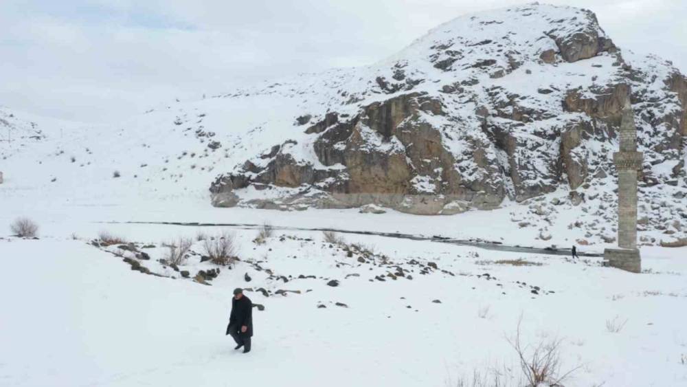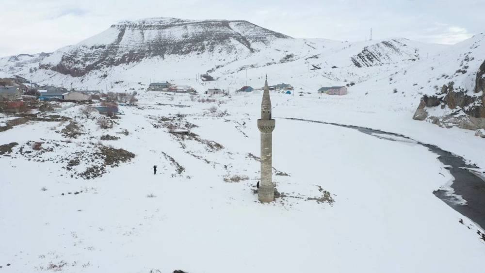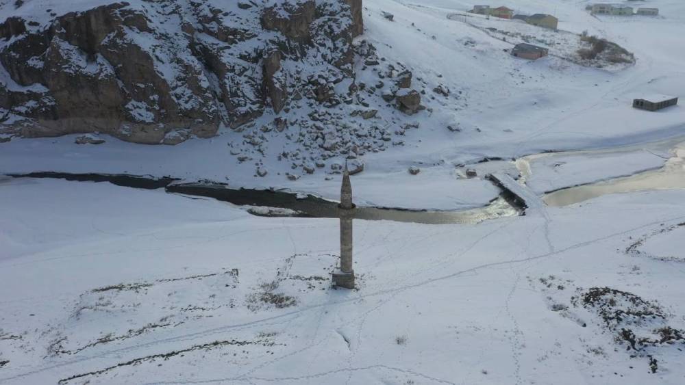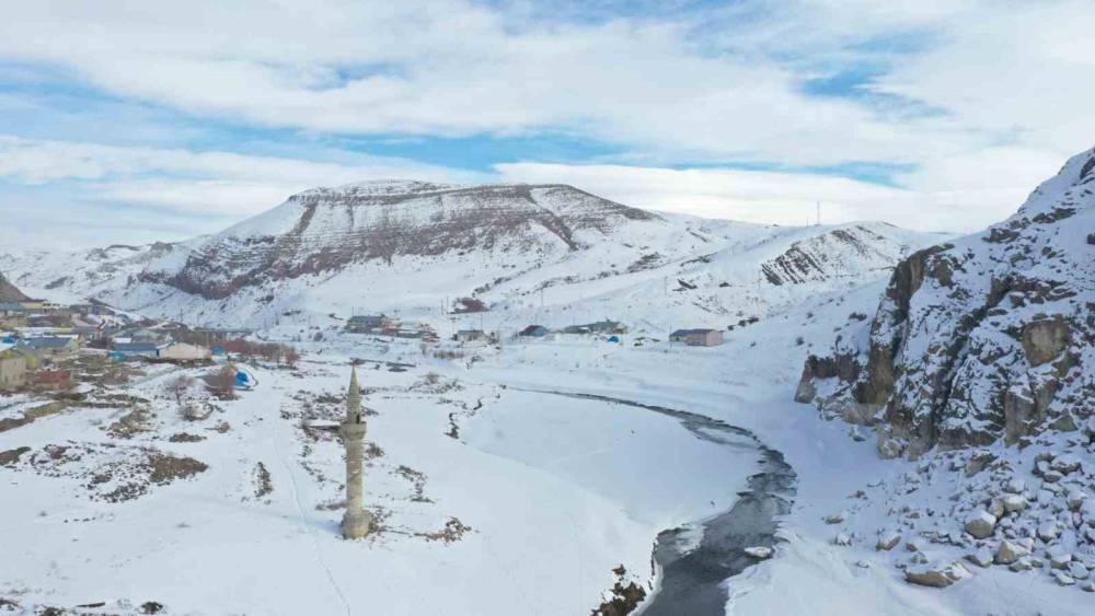 Ağrı’nın merkeze bağlı Başçavuş köyünde, baraj sularının çekilmesiyle yeniden görünür hale gelen tarihi minare, kış mevsiminde karlar altındaki görüntüsüyle ilgi odağı oldu.