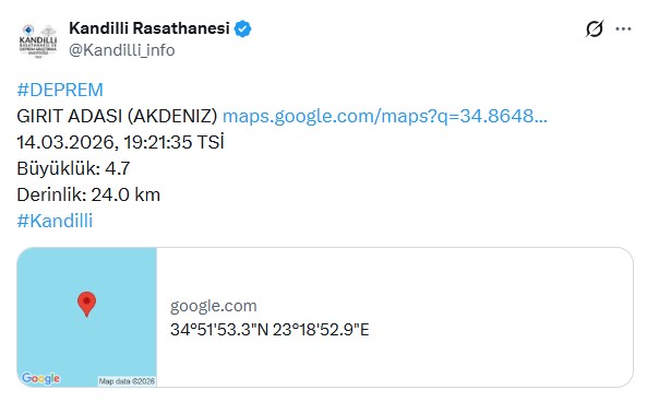 Kandilli Rasathanesi Akdeniz açıklarında 4.7 büyüklüğünde bir deprem meydana geldiğini açıkladı. Girit Adası'nın merkez üssü olarak kaydedildiği sarsıntıyla ilgili verileri paylaşan merkez, deprem derinliğini ise 24 kilometre olarak ölçtü.