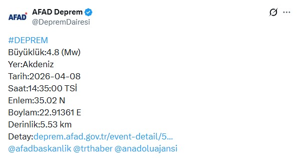 Afet ve Acil Durum Yönetimi Başkanlığı (AFAD), Akdeniz açıklarında 4.8 büyüklüğünde bir deprem meydana geldiğini duyurdu.