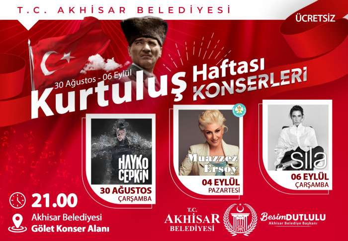 Akhisar Belediyesi tarafından 30 Ağustos Zafer Bayramı ve 6 Eylül Akhisar’ın Düşman İşgalinden Kurtuluşunun yıldönümünde iki dev konser gerçekleştirilecek. Konserlerde 30 Ağustos’ta Rock müziğinin sevilen sanatçısı Hayko Cepkin, 6 Eylül’de ise ünlü şarkıcı Sıla sahne alacak.