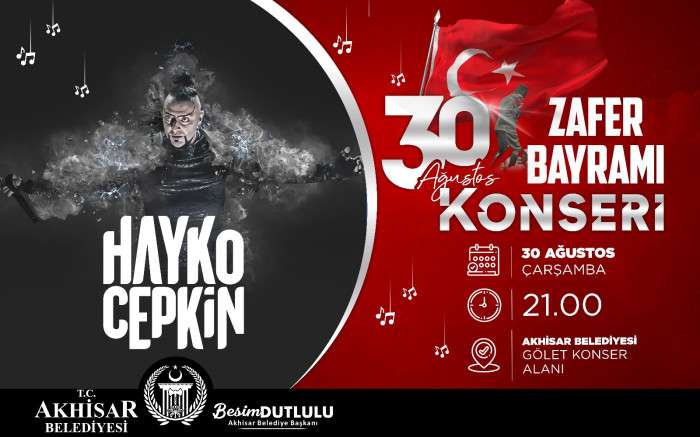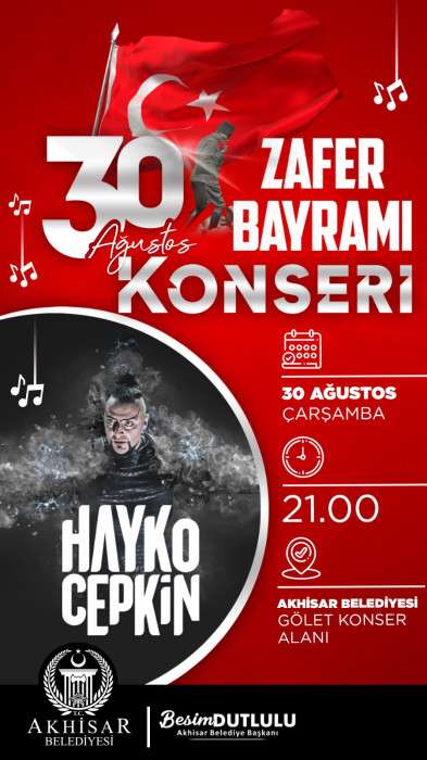 İlk olarak 30 Ağustos Zafer Bayramı’nda Türk Rock Müziğinin önemli sanatçılarından Hayko Cepkin sahne alacak. Ünlü Rockçı 30 Ağustos Çarşamba günü, Akhisar Belediyesi Hüsnü Kahraman Kültür Parkı Gölet Konser alanında saat 21.00’de hayranlarıyla buluşarak en sevilen şarkılarını Zafer Bayramı coşkusuyla Akhisarlılar ile birlikte seslendirecek.