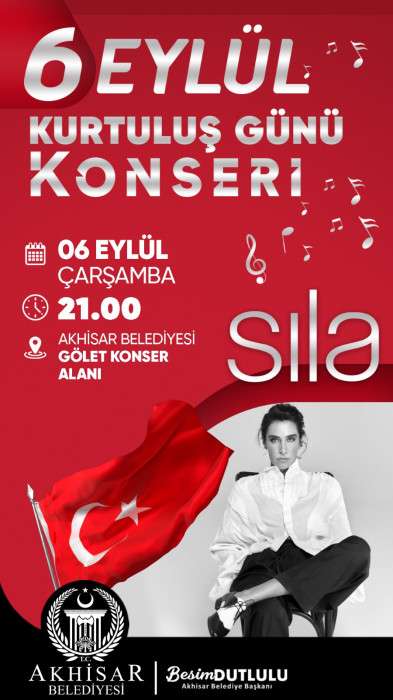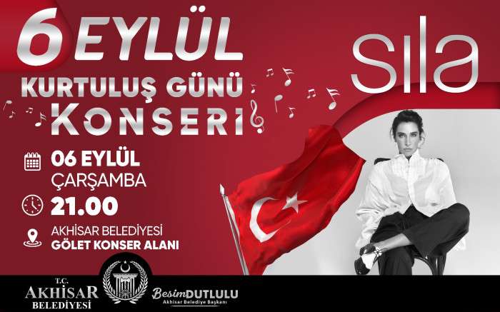 Bu coşku, 6 Eylül’de ise bu kez ünlü popçu Sıla ile devam edecek. Sevilen şarkıcı Sıla da 6 Eylül Çarşamba günü saat 21.00 ‘de Akhisar Belediyesi Hüsnü Kahraman Kültür Parkı Gölet Konser alanında en sevilen şarkılarını Kurtuluş gününe özel seslendirecek.