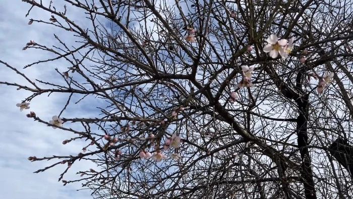 Manisa’nın Alaşehir ilçesinde Şubat ayında etkili olan sıcak hava dalgası, badem ve erik ağaçlarının kış ortasında çiçek açmasına neden oldu. Doğanın bahar manzarasına büründüğü ilçede çiftçiler, muhtemel bir don felaketinin rekolteyi vurmasından endişe ediyor.