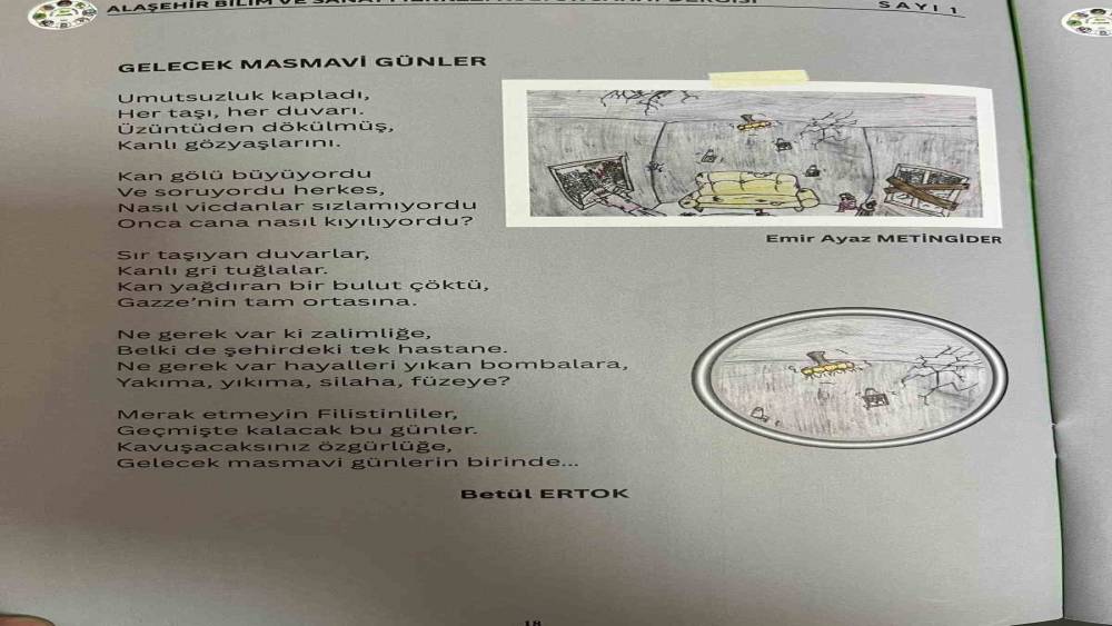 Manisa’nın Alaşehir ilçesinde Bilim ve Sanat Merkezi öğrencileri tarafından hazırlanan Filistin temalı "Düşten Beri" dergisinin tanıtım programında, öğrencilerin kaleme aldığı şiirler okunarak Filistinli çocuklar için güçlü vicdan mesajları verildi.