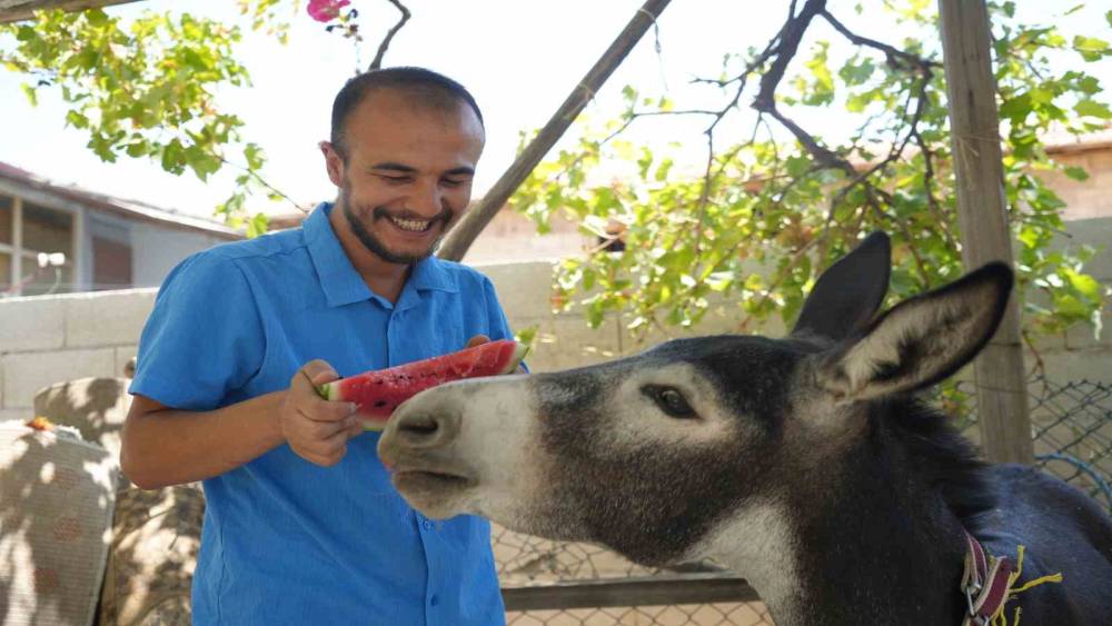 Gaziantep’te yaşayan Ömer Sezgin, sosyal medyada gördüğü, annesi ölen yavru eşeği sahiplenmek için Mardin’e gitti. Derik ilçesinde bulduğu eşeği nakliye aracıyla Gaziantep’e getiren Sezgin, "Şanslı" adını verdiği minik dostuna adeta gözü gibi bakıyor, elleriyle besliyor.