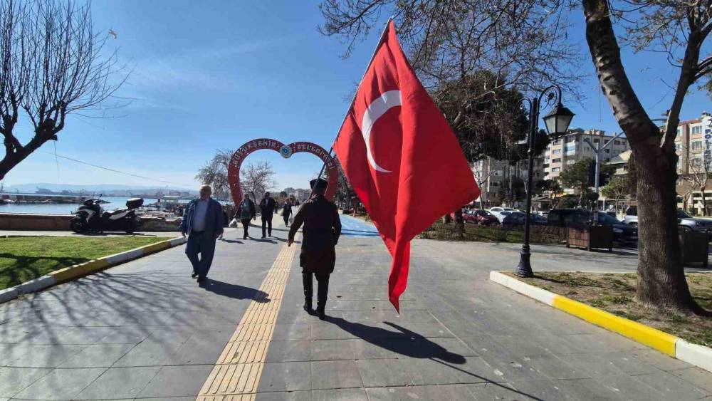 Askeri kıyafeti ve elinde Türk bayrağıyla İstanbul’dan Çanakkale’ye yürüyor
