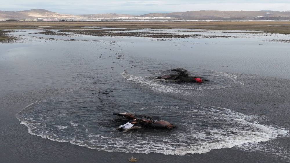Kayseri’de iki doğaseverin atla olan gezisi görünmeyen bir kaza nedeniyle suda biterken, o anlar dron kamerasına yansıdı.