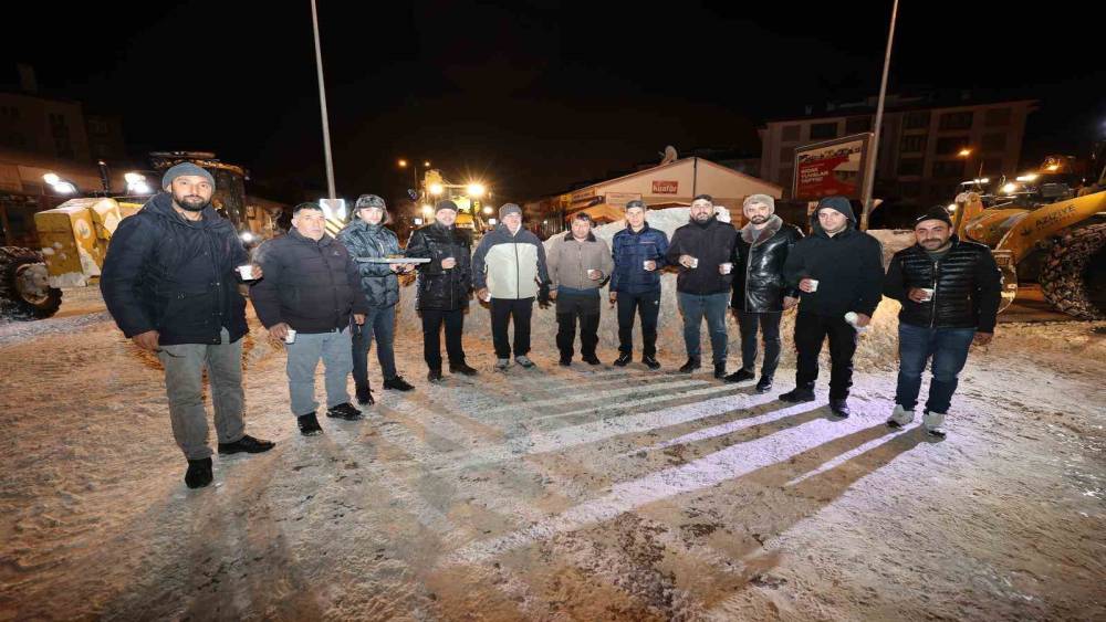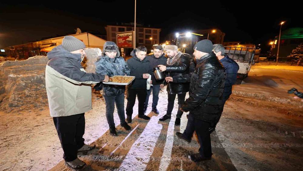 Aziziye Belediye Başkanı Emrullah Akpunar, sahada karla mücadele çalışması yürüten belediye işçilerine gece yarısı tatlı sürprizi yaptı. Başkan Akpunar, vardiya sistemiyle çalışan karla mücadele ekipleriyle sabaha karşı 03.00 sularında bir araya geldi.