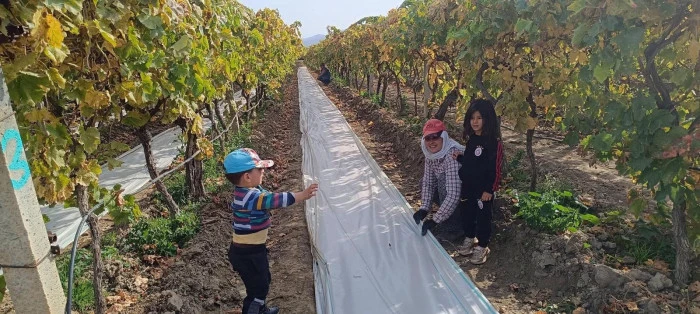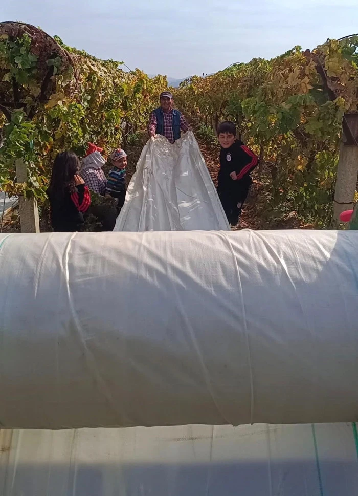 Sarıgöl ve çevresinde binlerce dekarlık alanda yapılan bağcılıkta, hasadın tamamlanmasıyla birlikte temmuz ayında serilen koruyucu örtüler sökülmeye başlandı. Üreticiler yoğun mesaiyle örtüleri gelecek yıl için depoluyor.