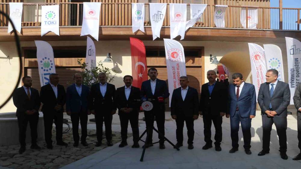 Asrın felaketinin, asrın inşa seferberliğine dönüştüğü ifade eden bakan Kurum, Kasım ayı içerisinde 350 bininci konutun anahtarını Cumhurbaşkanı Recep Tayyip Erdoğan’ın katılımıyla hak sahibi vatandaşa teslim edileceğini belirterek "Devlet-millet el ele vererek, Asrın Felaketini Asrın İnşa Seferberliğine dönüştürdük. Bugün depremden etkilen 11 ilimizde 7 gün 24 saat alın teri döken 200 bin mühendis, mimar ve işçi kardeşimizle birlikte, depremzede kardeşlerimizi bir an önce yuvalarına kavuşturmanın gayreti içindeyiz. Geçtiğimiz ay Malatya’da Sayın Cumhurbaşkanımızın teşrifleriyle 304 bininci yuvamızın anahtarlarını hak sahibi kardeşlerimize teslim ettik. Söz verdiğimiz 453 bin yuvanın, yüzde 70’ini tamamladık. Yani şu anda; her 3 depremzede kardeşimizden 2’sini yeni yuvasına kavuşturduk. Önümüzdeki ay 350 bininci konutumuzun anahtarlarını yine Cumhurbaşkanımızla birlikte teslim edeceğiz. inşallah yılsonuna geldiğimizde burada olacağız, son anahtarlarımızı da vatandaşlarımızla buluşturacağız. Biz milletimize ne söz verdiysek, fazlasıyla yerine getirmek için gece gündüz durmaksızın ilerliyor, milletimizin dualarına nail olabilmek için var gücümüzle azimle, kararlılıkla çalışıyoruz. Bugün geldiğimiz noktada Hatay’ımızda 86 bin konut ve iş yerimizi tamamladık ve hak sahibi kardeşlerimize teslim ettik. Şu anda şehrimizde 66 binin üzerinde konut, iş yeri ve köy evinin inşaatına süratle devam ediyoruz. Söz verdiğimiz gibi bu yılın sonuna kadar Hatay’ımız da 153 bin bağımsız bölümü teslim edeceğiz. Deprem bölgesinin tamamın da ise 453 bin yuvamızı tamlayarak hak sahibi kardeşlerimizi güvenli ve huzurlu yuvalarına kavuşturacağız" ifadelerini kullandı.