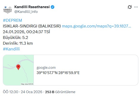 Kandilli Rasathanesi'nden yapılan açıklamaya göre, Balıkesir'in Sındırgı ilçesinde saat 00.24'te 5.2 büyüklüğünde bir deprem oldu. AFAD resmi hesabı ise depremin büyüklüğünü 5.1 olarak açıkladı. Deprem İstanbul başta olmak üzere Marmara ve Ege Bölgesi'nde de hissedildi.