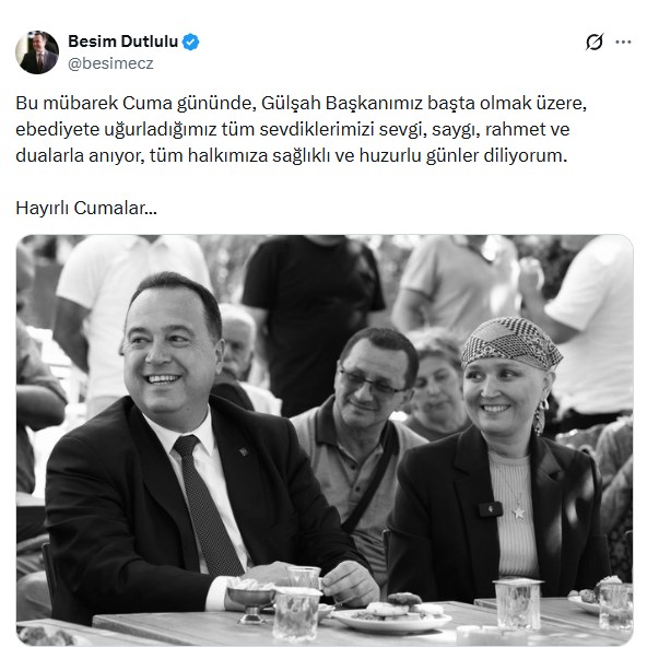Sosyal medya hesabından paylaşımda bulunan Başkan Dutlulu, "Bu mübarek Cuma gününde, Gülşah Başkanımız başta olmak üzere, ebediyete uğurladığımız tüm sevdiklerimizi sevgi, saygı, rahmet ve dualarla anıyor, tüm halkımıza sağlıklı ve huzurlu günler diliyorum. Hayırlı Cumalar…" dedi.