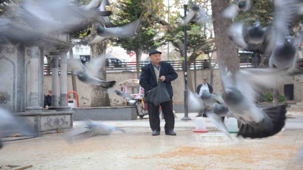 Bilecik’te yaklaşık 2 yıldır Şehitler Parkı’nda inen yaklaşık 300 güvercine bakan Hüseyin Ortakaya, bayramda eşini dostunu bıraktı, beslediği kuşlara koştu.