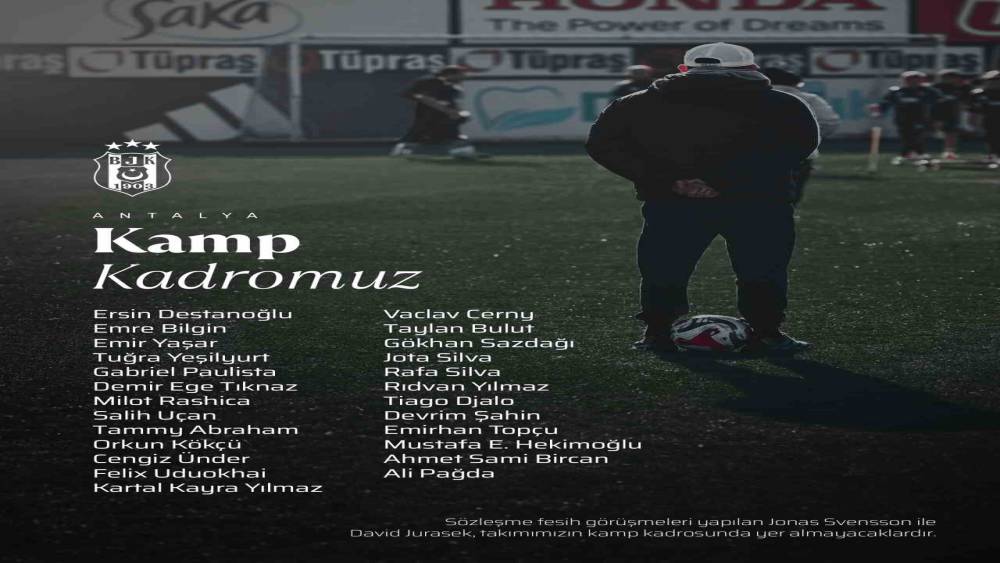 Trendyol Süper Lig’in ikinci yarısı için hazırlıklarını Antalya’da yapılacak kampta sürdürecek olan Beşiktaş’ta kamp kadrosu belli oldu.Devre arası çalışmalarını Antalya’da sürdürecek olan Beşiktaş’ta kampa katılacak oyuncuların isimleri belli oldu. Siyah-beyazlılarda sözleşme fesih görüşmeleri yapılan David Jurasek ve Jonas Svensson ile geçtiğimiz hafta futbol planlamasında yer almayacağı açıklanan Necip Uysal, kamp kadrosunda yer almadı.Kulüpteki geleceği belirsizliğini koruyan Rafa Silva ise kamp kadrosunda yer aldı.Beşiktaş’ın 25 kişilik Antalya kampı kadrosu şu isimlerden oluştu:"Ersin Destanoğlu, Emre Bilgin, Emir Yaşar, Tuğra Yeşilyurt, Gabriel Paulista, Demir Ege Tıknaz, Milot Rashica, Salih Uçan, Tammy Abraham, Orkun Kökçü, Cengiz Ünder, Felix Uduokhai, Kartal Kayra Yılmaz, Vaclav Cerny, Taylan Bulut, Gökhan Sazdağı, Jota Silva, Rafa Silva, Rıdvan Yılmaz, Tiago Djalo, Devrim Şahin, Emirhan Topçu, Mustafa Hekimoğlu, Ahmet Sami Bircan ve Ali Pağda."