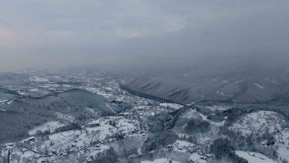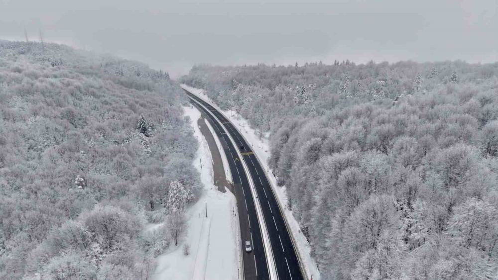 Türkiye’nin önemli geçiş güzergahlarından Bolu Dağı’nda kar yağışının ardından oluşan beyaz örtü havadan görüntülendi.