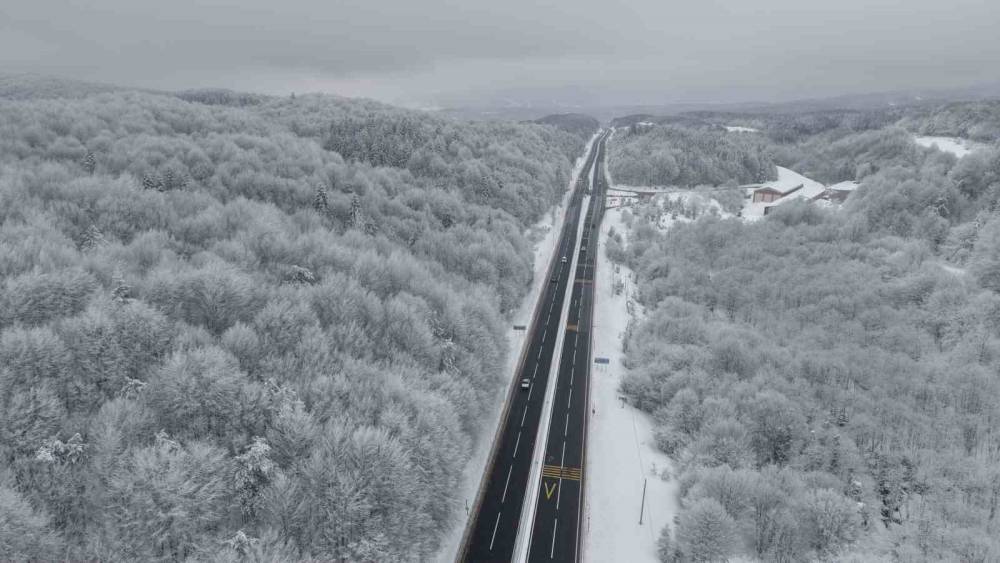 İstanbul ile Ankara arasında ulaşımı sağlayan D-100 kara yolu ve Anadolu Otoyolu’nun Bolu Dağı kesiminde etkili olan yağışın ardından ormanlık alanlar karla kaplandı. Bölgedeki çam ağaçlarının beyaz örtüyle bütünleşmesi ve iki ana ulaşım aksının aynı karede yer aldığı anlar havadan kayda alındı.