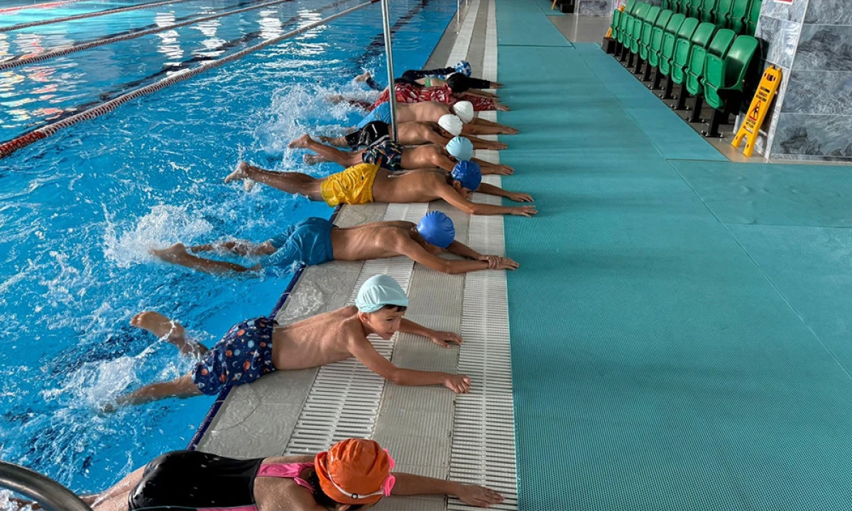 Aydın’ın Bozdoğan ilçesinde faaliyete geçen yarı olimpik yüzme havuzunda eğitim gören çocuklar hem eğleniyor hem de yüzme öğreniyor.