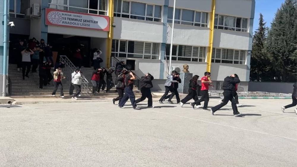 Burdur’da 15 Temmuz Şehitler Anadolu Lisesi’nde deprem tatbikatı düzenlendi. Senaryo gereği Kemer ilçesinde 7 büyüklüğünde bir deprem yaşandı. Deprem anında çök-kapan-tuttun uygulamasını yapan öğrenciler, daha sonra öğretmenlerinin koordinasyonunda okul dışına çıkarak güvenli alanda toplandı. Deprem esnasında çıkan yangına itfaiye ekipleri müdahale ederken, sınıfta mahsur kalan öğrenci ekipler tarafından kurtarıldı. Tatbikatta yaralı yakınını canlandıran öğrenciler ise ekiplere zorluk çıkararak, yakınları enkaz altında kalmış gibi ağladı.