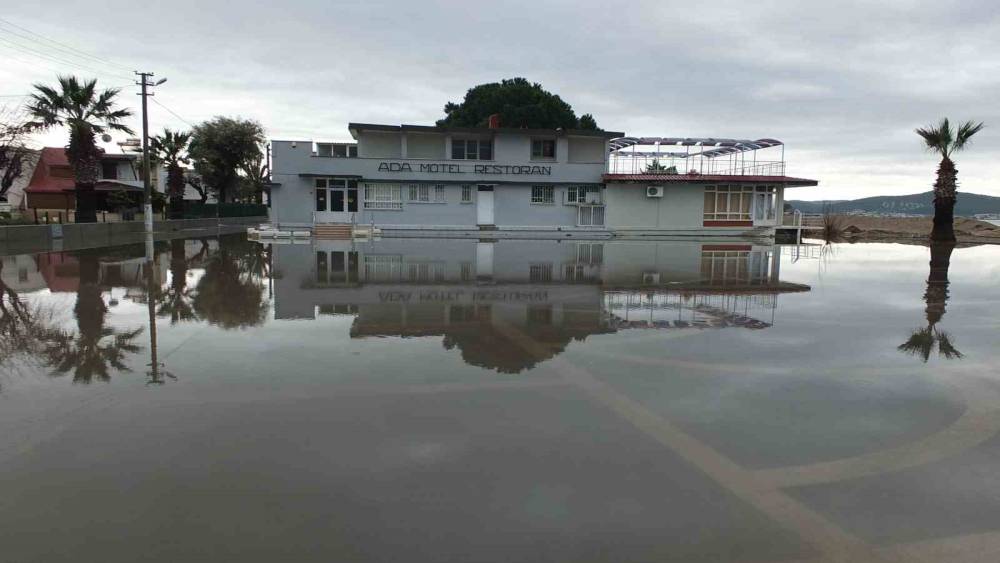 Balıkesir’in Burhaniye ilçesinde, etkili olan sağanak nedeniyle yollar göle döndü, evlerin bodrum katlarını su bastı ve denizin rengi değişti.