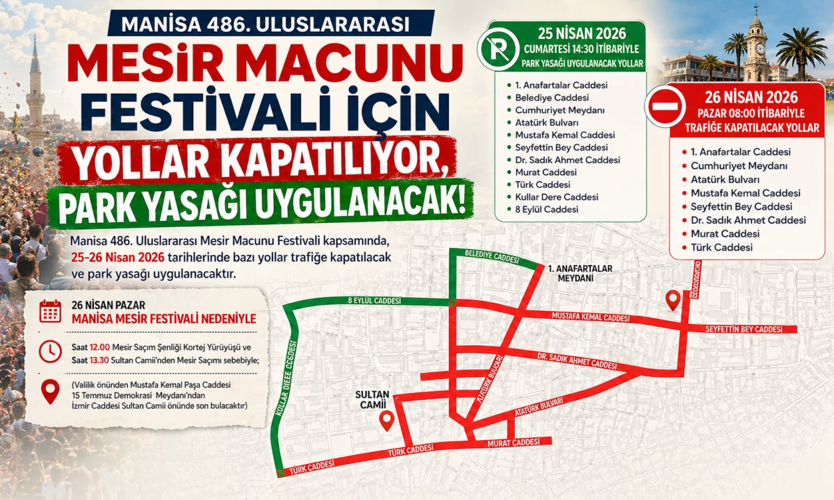 Manisa 486. Uluslararası Mesir Macunu Festivali kapsamında, 25-26 Nisan 2026 tarihlerinde bazı yollar trafiğe kapatılacak, park yasağı uygulanacak.