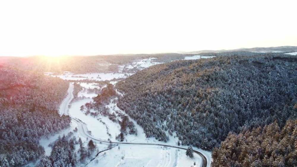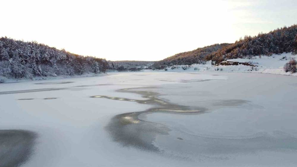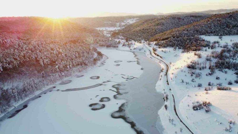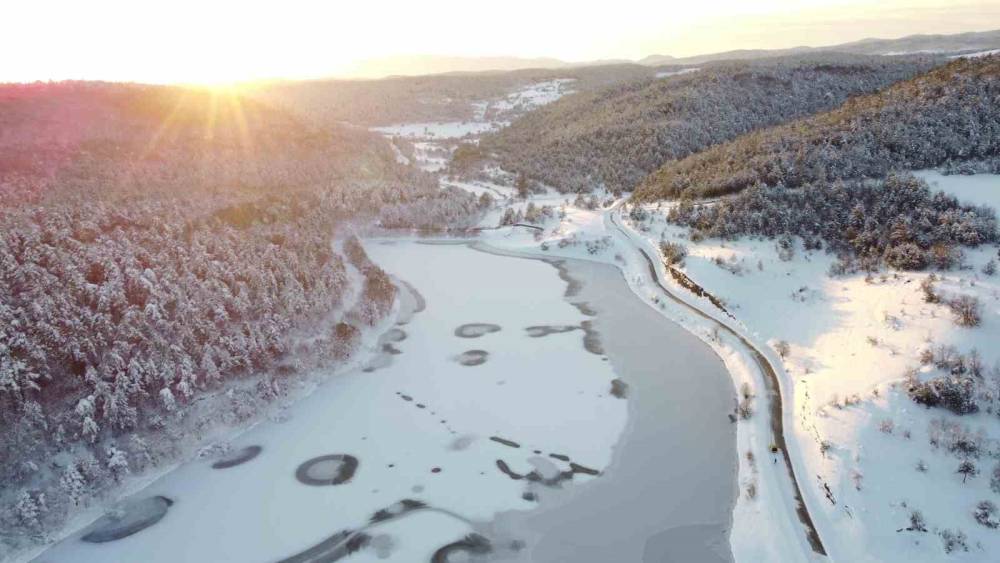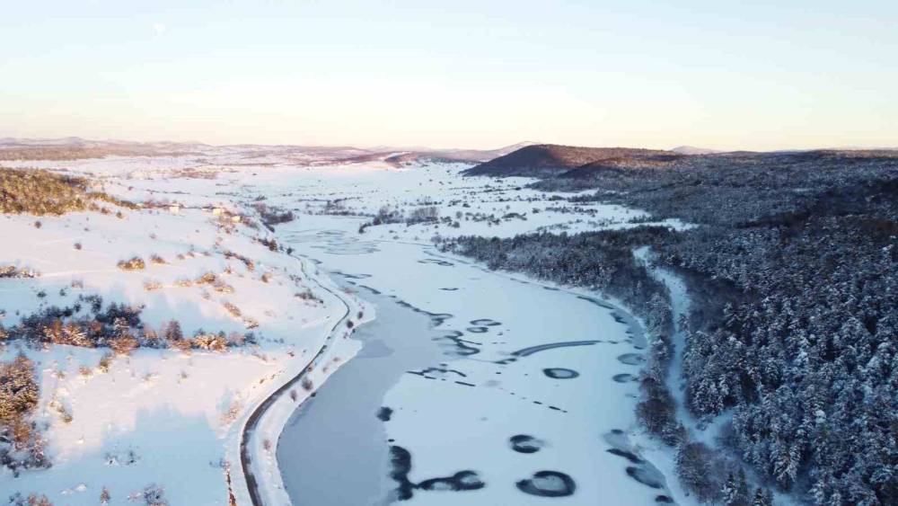 Buz tutan göletler ve çevresindeki karla kaplı alanlar, havadan kaydedilen görüntülerde kartpostallık manzaralar sunarken, bölgedeki kış güzelliği dikkat çekti.