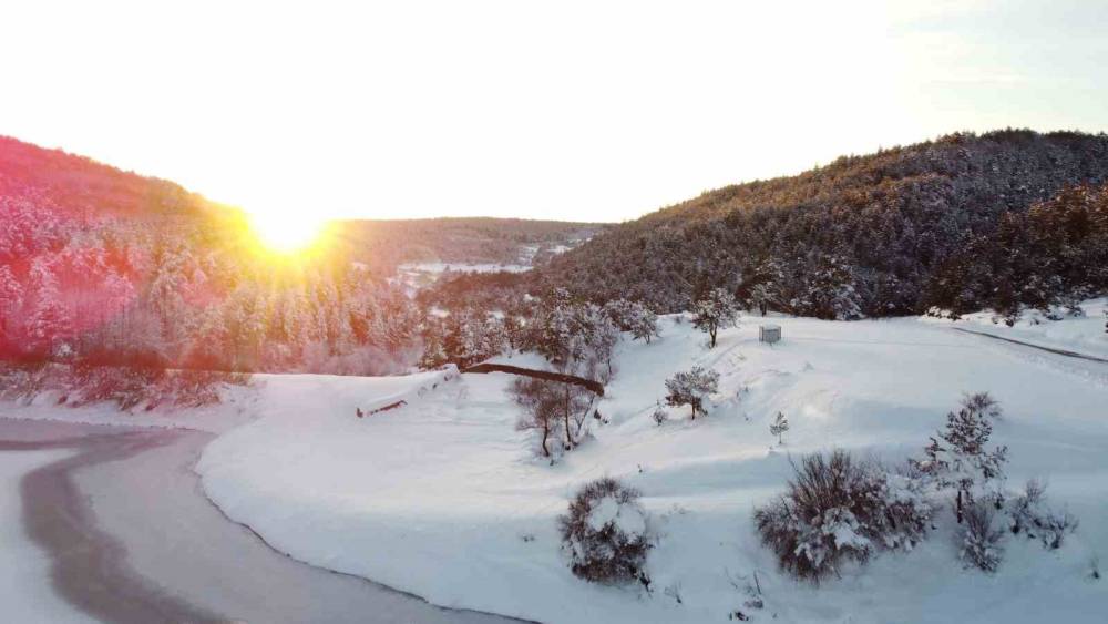 Karabük’ün Eflani ilçesinde kar yağışı ve eksi 20 dereceye kadar düşen hava sıcaklıkları sonrası yüzeyi buz tutan göletler, oluşan kartpostallık manzaralarla dron ile görüntülendi.Karabük’ün Eflani ilçesi gece yarısı sıfırın altında 20 derece ile en soğuk geceyi yaşadı.Soğuk havanın ardından Bostancılar, Kadıköy ve Ortakçılar göletlerinin yüzeyleri buz tuttu.Göletler güneşin de yüzünü göstermesiyle birlikte görsel şölen oluşturdu.Buz tutan göletler ve çevresindeki karla kaplı alanlar, havadan kaydedilen görüntülerde kartpostallık manzaralar sunarken, bölgedeki kış güzelliği dikkat çekti.