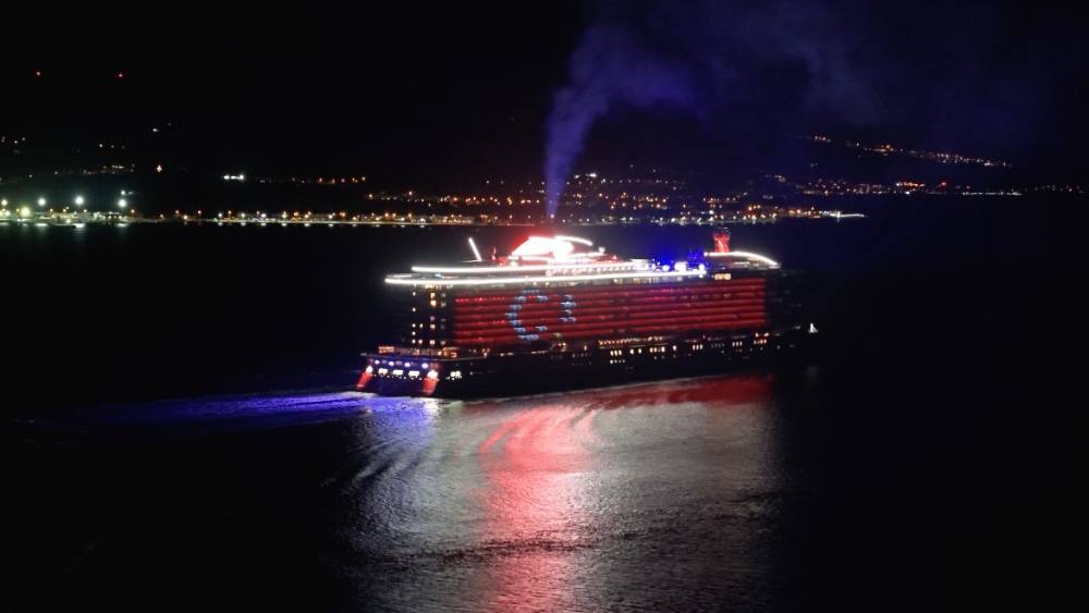 Çanakkale Boğazı’ndan geçen Bahamalar bayraklı ’Resilient Lady’ isimli kruvaziyer gemisi gövdesindeki ışıklarla Türk bayrağı oluşturdu.
