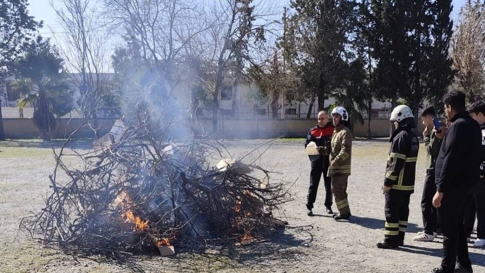 Hatay’da lise öğrencilerine temel yangın eğitimi verildi ve tatbikat düzenlendi.