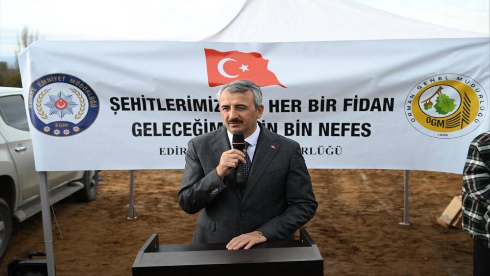 Edirne’nin Lalapaşa ilçesine bağlı Çömlekköy köyünde düzenlenen etkinlikte toplam 500 fidan toprakla buluştu.Emniyet Genel Müdürlüğü Daire Başkanlığı ile Orman Genel Müdürlüğü’nün "Şehitlerimiz İçin Bir Fidan, Geleceğimiz İçin Bir Nefes" projesi kapsamında Lalapaşa ilçesine bağlı Çömlekköy köyünde toplam 500 fidan toprakla buluştu.Etkinlikte konuşan İl Emniyet Müdürü Muhittin Ayhan, şehitlerin hatırasını yaşatmanın önemine değinerek, "Şehitlerimizin aziz hatırasını yaşatmak, millî birlik bilincini güçlendirmek ve gençlerimizin doğa sevgisini pekiştirmek amacıyla burada 500 fidanı toprakla buluşturacağız" dedi.Vali Yunus Sezer ise şehitlerin bu vatanı korumak için can verdiğini vurguladı. Bu toprakların her karışında şehitlerin kanı, emeği ve gazilerin alın teri bulunduğunu belirteren Sezer, "Bu topraklar bizim için çok kıymetli" ifadelerini kullandı.Ağaçların ve ormanların önemine dikkat çeken Vali Sezer, yaz aylarında yaşanan orman yangınlarının ardından devletin yeni hedefler belirlediğini hatırlatarak, "Yanan ormanlardan daha fazlasını dikeceğiz ve gelecek nesillere daha güzel bir vatan bırakacağız" dedi.