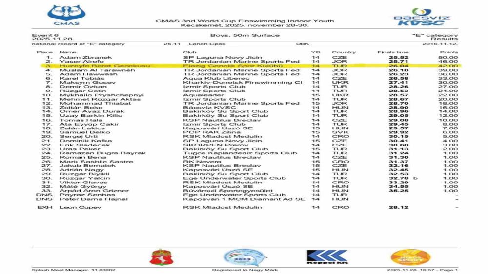 Macaristan’ın Kecskemet kentinde düzenlenen CMAS 2025 Paletli Yüzme Gençler Dünya Kupası, dünyanın birçok ülkesinden genç sporcuların katılımıyla gerçekleştirildi. Elazığ’ı temsilen yarışmalara Elazığ Gençlik ve Spor Kulübüne bağlı 5 sporcu ve 3 antrenör katıldı. Dünya Kupası’nda yarışan genç sporcular arasında üstün performans sergileyen Huzeyfe Berat Gecekuşu, iki farklı kategoride önemli başarı elde etti. Gecekuşu, 50 metre su üstü ve 200 metre su üstü stillerinde gösterdiği başarılı derecelerle dünya 3.’sü olarak bronz madalya kazandı. Genç yüzücünün başarısı hem kulübünde hem de Elazığ spor camiasında sevinç oluşturdu.
