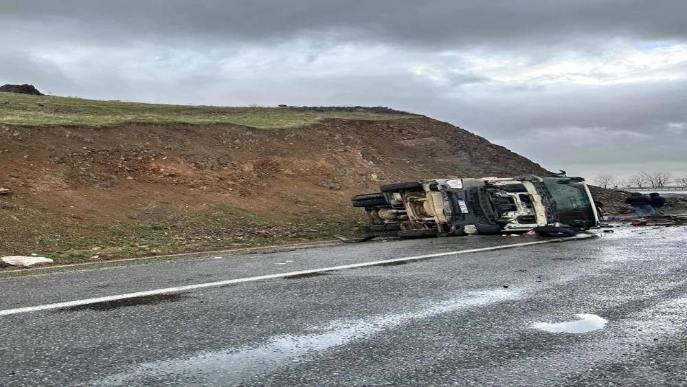 Elazığ’da yağıştan dolayı sürücüsünün direksiyon hakimiyetini kaybettiği beton pompa aracı yan yattı. Kazada 1 kişi yaralandı.