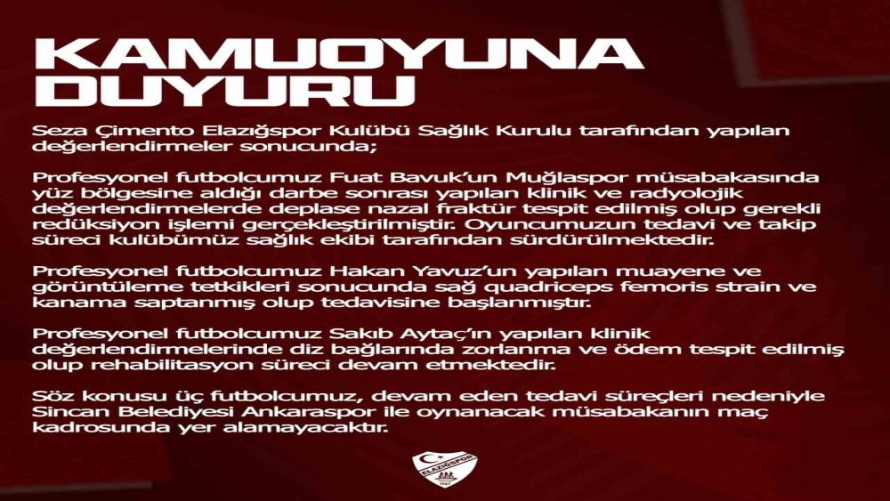Elazığspor sağlık heyetinden yapılan yazılı açıklamada; "Profesyonel futbolcumuz Fuat Bavuk’un Muğlaspor müsabakasında yüz bölgesine aldığı darbe sonrası yapılan klinik ve radyolojik değerlendirmelerde deplase nazal fraktür tespit edilmiş olup gerekli redüksiyon işlemi gerçekleştirilmiştir. Oyuncumuzun tedavi ve takip süreci kulübümüz sağlık ekibi tarafından sürdürülmektedir. Profesyonel futbolcumuz Hakan Yavuz’un yapılan muayene ve görüntüleme tetkikleri sonucunda sağ quadriceps femoris strain ve kanama saptanmış olup tedavisine başlanmıştır. Profesyonel futbolcumuz Sakıb Aytaç’ın yapılan klinik değerlendirmelerinde diz bağlarında zorlanma ve ödem tespit edilmiş olup rehabilitasyon süreci devam etmektedir. Söz konusu üç futbolcumuz, devam eden tedavi süreçleri nedeniyle Sincan Belediyesi Ankaraspor ile oynanacak müsabakanın maç kadrosunda yer alamayacaktır" denildi.