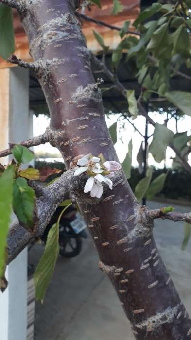 Emcelli Mahallesi'nde yaşayan Ahmet Karadağ'ın Ören mevkiindeki bağ evinin önündeki sekiz yıllık kiraz ağacı henüz yapraklarını dökmeden tekrar çiçek vermeye başladı.