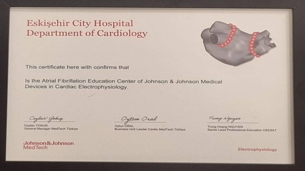 Eskişehir Şehir Hastanesi Elektro Fizyoloji Merkezi, Uluslararası Johnson and Johnson Enstitüsü tarafından "Uluslararası Atriyal Fibrilasyon Eğitim Merkezi" olarak belgelendirildi.