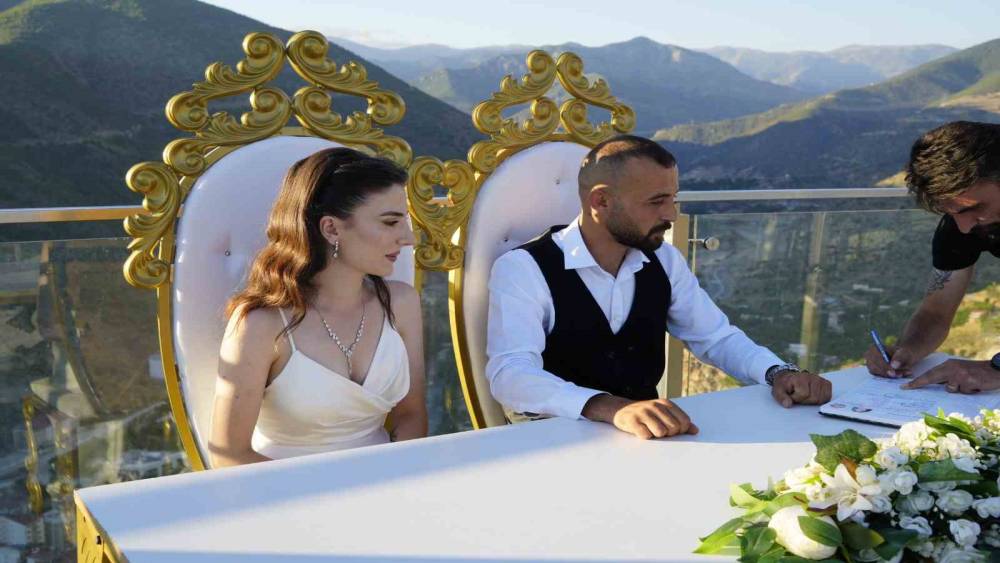 Türkiye ve Avrupa’nın en yüksek cam seyir terasları arasında yer alan 240 metre yükseklikteki Torul Kalesi Cam Seyir Terası, nikâh törenine ev sahipliği yaptı.