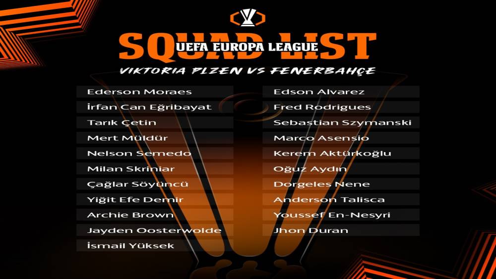 Fenerbahçe’nin, UEFA Avrupa Ligi 4. haftasında yarın deplasmanda Çekya ekibi Viktoria Plzen ile oynayacağı maçın kamp kadrosu belli oldu.UEFA Avrupa Ligi 4. haftasında Fenerbahçe, yarın TSİ 23.00’te Çekya temsilcisi Viktoria Plzen’e konuk olacak. Bu müsabakanın hazırlıklarını tamamlayan sarı-lacivertliler, özel uçakla Plzen’e hareket etti.Fenerbahçe’nin 21 kişilik kamp kadrosunda da şu oyuncular yer alıyor:"Ederson Moraes, İrfan Can Eğribayat, Tarık Çetin, Mert Müldür, Nelson Semedo, Milan Skriniar, Çağlar Söyüncü, Yiğit Efe Demir, Archie Brown, Jayden Oosterwolde, İsmail Yüksek, Edson Alvarez, Fred, Sebastian Szymanski, Marco Asensio, Oğuz Aydın, Kerem Aktürkoğlu, Dorgeles Nene, Anderson Talisca, Youssef En-Nesyri, Jhon Duran."