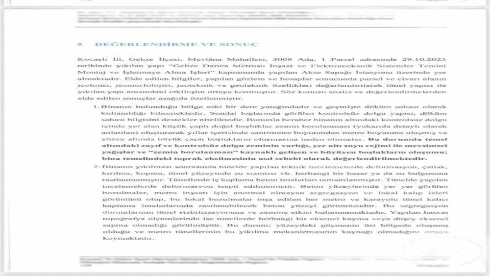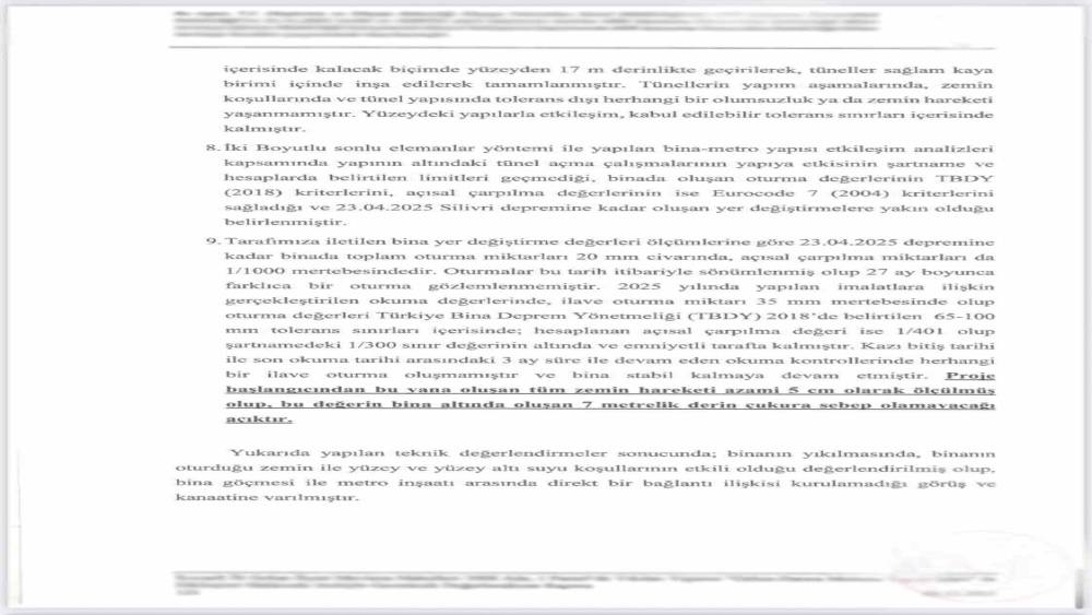 Raporda, metro proje inşaatı süresince ölçülen toplam zemin hareketinin azami 5 santimetre seviyesinde kaldığı ve bu değerin bina altında aniden oluşan büyük ölçekli boşluğu açıklayacak nitelikte olmadığı vurgulanıyor. Binanın zemin oturmalarının da ilgili yönetmeliklerde belirtilen sınırlar içinde kaldığı, zamanla sönümlendiği ve sonrasında ilave bir hareket gözlenmediği aktarılıyor.
