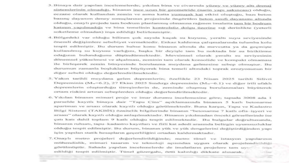 Hazırlanan jeolojik-geoteknik değerlendirme raporu, meydana gelen bina çökmesine ilişkin önemli bulgular ortaya koydu. Raporda yer alan değerlendirmelere göre; çökmenin temelinde binanın bulunduğu zayıf zemin koşulları ve yapıdaki imalat kusurları bulunuyor. Ayrıca raporda çöken binanın eski bir dere yatağı ve döküm sahası niteliğindeki kontrolsüz dolgu zemin üzerine inşa edildiği, temelinin ise yüzeysel ve yetersiz olduğunun tespit edildiği belirtiliyor.