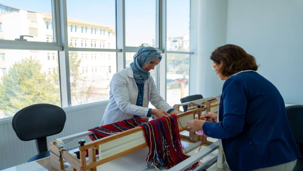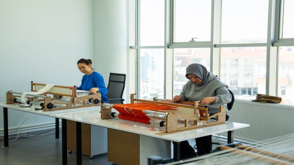 Elde edilen iplikler, Zübeyde Hanım Aile Yaşam Merkezi bünyesinde, uzman eğitmenler eşliğinde kursiyerlerin üretimine sunuluyor. Geleneksel dokuma teknikleriyle tezgahlarda işlenen bu iplikler, kursiyerlerin emekleriyle ilmek ilmek yeniden hayat buluyor. Böylece hem atıkların geri dönüşümü sağlanıyor hem de ortaya estetik ve kullanışlı ürünler çıkıyor.