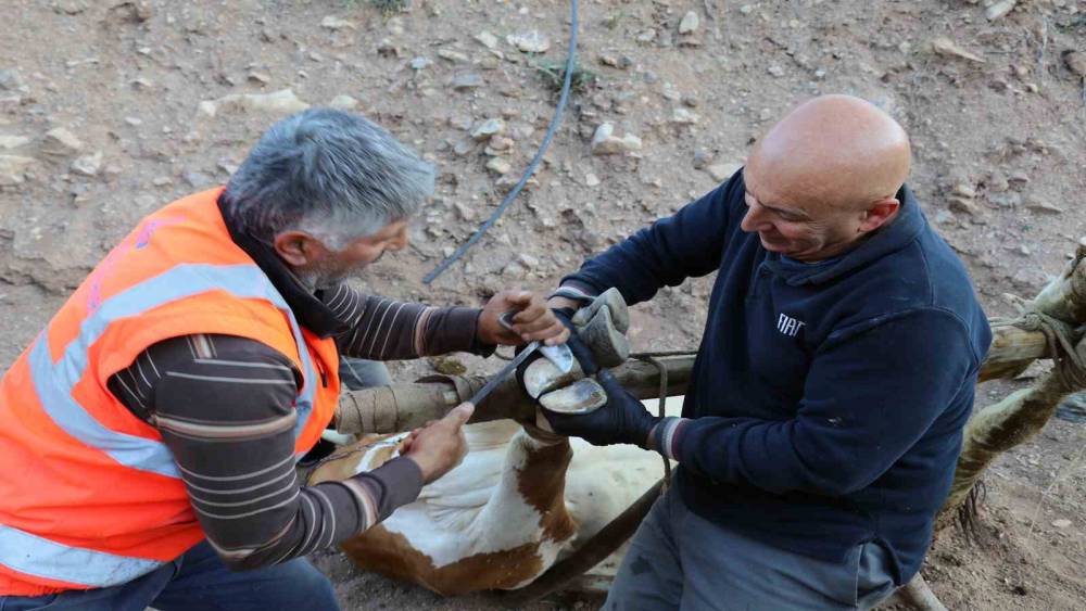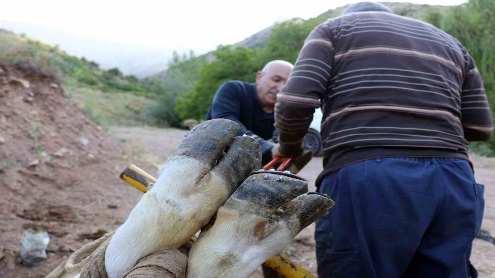 Hayvanlar halatla yere yatırıldıktan sonra ayakları bağlanıp yüz yıllardır kullanılan malzemeler yardımıyla mahalledeki nalbant tarafından ayaklarına nalları çakılıyor.