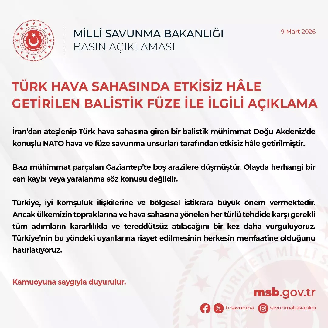 Orta Doğu'daki savaş zaman zaman bölgeye yayılırken, Gaziantep'ten gelen bir haber gündem oldu. Güneyşehir bölgesine bir füze parçası düştüğü belirlendi. Jandarma bölgede güvenlik önlemi aldı. Daha önce de İran'dan atılan bir füze Hatay'a düşmüş; Ankara ile Tahran arasındaki telefon trafiğinde duyulan rahatsızlık iletilmişti. MSB'den yapılan açıklamada olayda can ya da mal kaybı yaşanmadığı bildirildi.