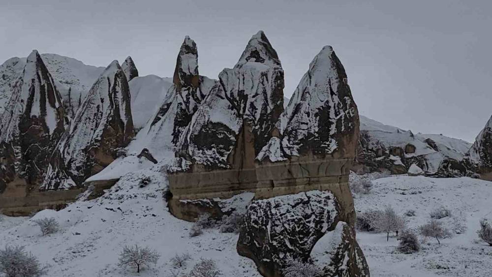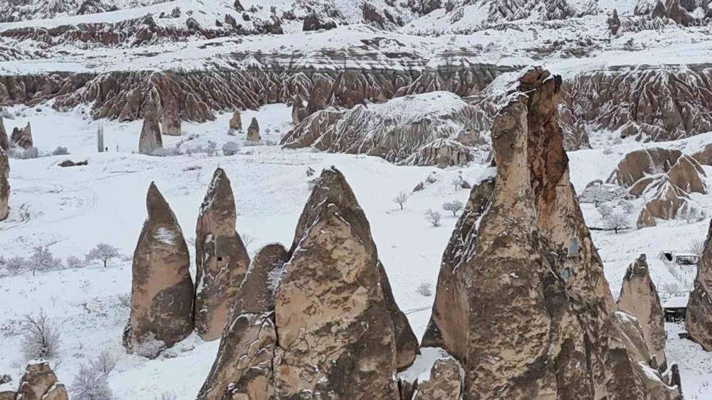 Türkiye’nin önemli turizm merkezlerinden Kapadokya’da etkili olan kar yağışı peribacalarını beyaza bürüyerek kartpostallık manzaralar oluşturdu. O manzara dron ile havadan görüntülendi.