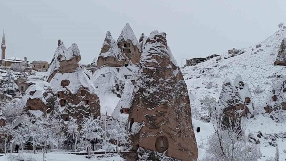 Kapadokya kar altında kartpostallık görüntüler oluştu