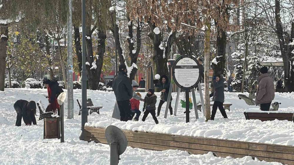 Düzce kar yağışı ile birikte beyaz gelinliğini giydi. Karın yağışına ise en çok çocuklar sevindi.
