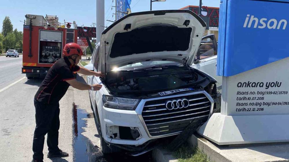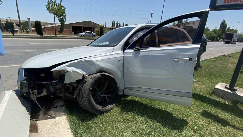 Çorum’da refüjü aşıp karşı şeritteki benzin istasyonunun tabelasına çarpan otomobilin sürücüsü ve yolcu kazayı yara almadan atlattı.
