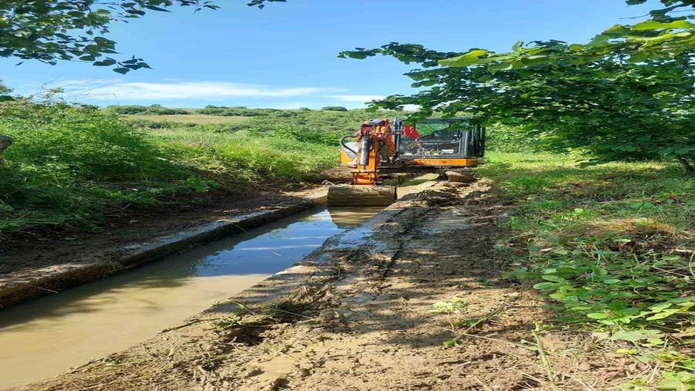 Kocaeli’de ekipler, tarlalara suyun kesintisiz ulaşması için kanal içindeki toprak, taş ve yabani otları temizliyor.