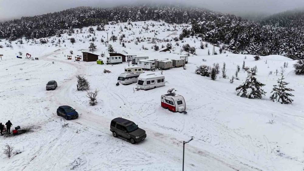 Ankara’nın Kızılcahamam ilçesinde bulunan Işık Dağı eteklerindeki Karagöl Jeositi, kar yağışıyla beyaza bürünürken, kış tatilini doğayla iç içe geçirmek isteyen Başkentlilerin yeni adresi Uludağ yerine Işık Dağı oldu.